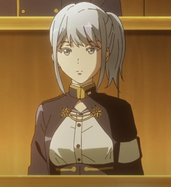 While in class, she wears the Republic's standard Prussian blue dress uniform, with officer shoulder and collar tabs to denote her position as a cadet. She wears a plain white armband to indicate her position.