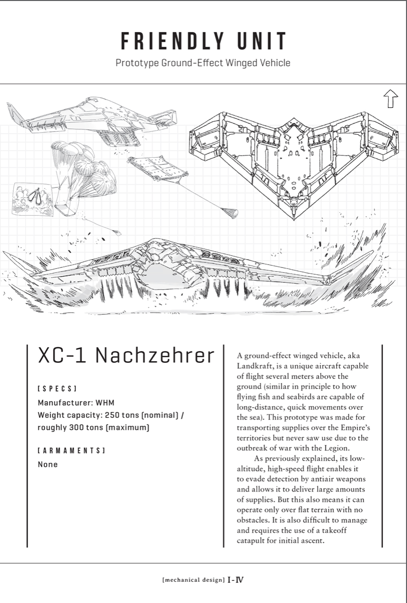 The XC-1 Nachzehrer (ナハツェーラー, Nahatsērā?) is a prototype ekranoplan developed by the Giadian Empire to transport supplies over the vast plains of the Wolfsland.